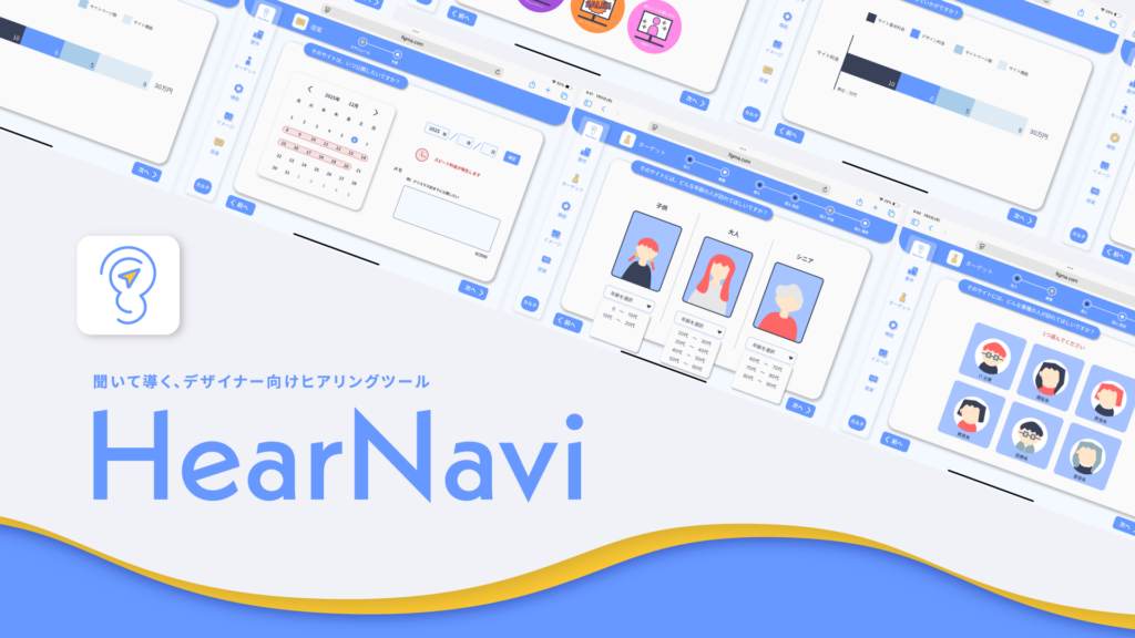 ヒアリング業務では、その後の制作につながる質問を通して、クライアントの要望や事業課題を「聞く」必要があります。そして、その課題をデザインで解決に「導く」提案をする必要があるのです。そこで、聞くと導くを掛け合わせて『HearNavi(ヒアナビ)』という作品を作りました。